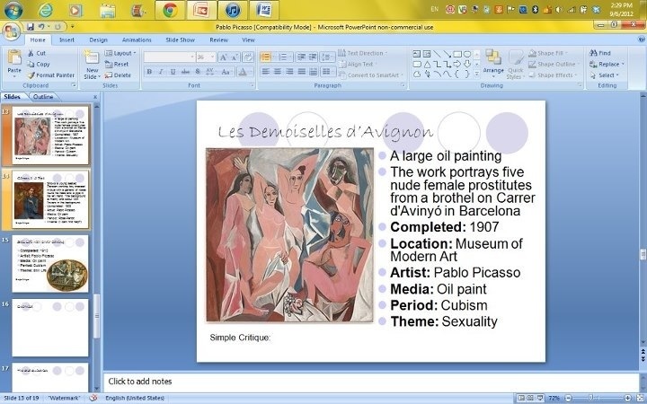 In the morning I was busy researching on Picasso and by late morning I finally collated all my data. I combined them into Tiffany’s PowerPoint slides after lunch and I have to say that it was no mean feat doing all that shit. So much for a stupid art project that no one even gives a damn about. Picasso must be really horny though. He has so many paintings on naked women. Bet he must’ve been to strip clubs when he was still alive.